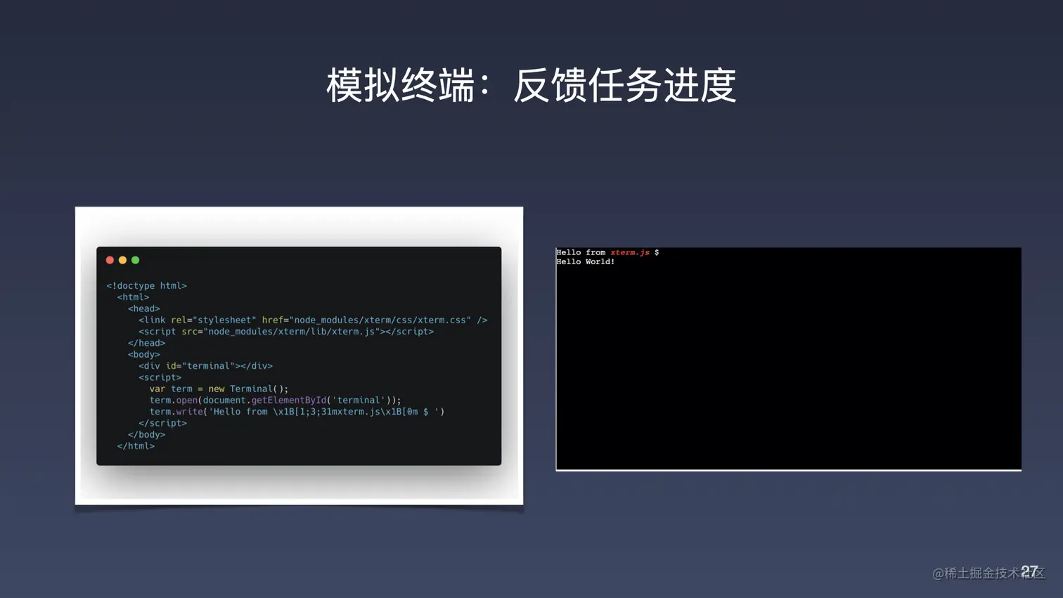 上面我们提到的是主进程中对整个命令执行方式的一些改变。那么在我们的渲染进程当中,我们要怎样去实现类似于刚才视频中的终端日志反馈呢?反馈的方式有很多,我们可以通过设计一些任务的步骤条,或者进度条这样的方式来给予整个任务进度的反馈。但是更好的方式是我们可以把任务的进度,包括整个任务输出日志进行一个及时的反馈。这边我们使用的是 xterm.js。它是一个基于 ts 所编写的一个前端终端组件,可以在浏览器内实现终端应用,VsCode 也是基于 xterm.js 来实现的终端的。要如何将主进程的日志来输出到渲染进程当中,就是我们上面所提到的,在拿到一个 EventEmitter 所广播的的输出之后,要通过主进程与渲染进程之间的通信,将数据推送到渲染进程,在渲染进程所需要做的一个处理,把接受到的命令输出,实时的渲染到 xterm 实现的终端组件上面来。
