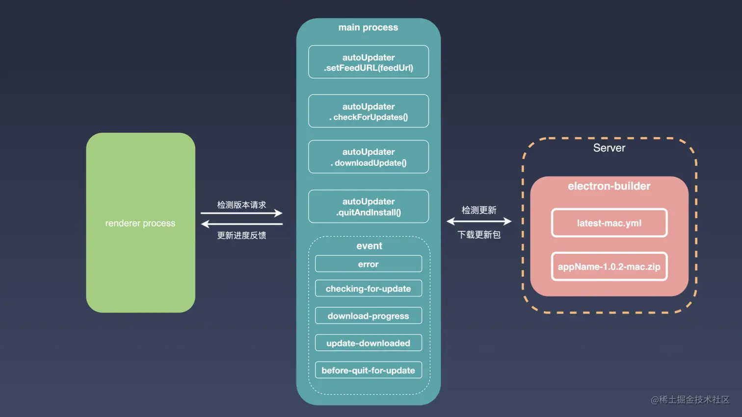首先需要设置 feedUrl,就是最新的更新包在更新服务端地址。当收到一个渲染进程的版本检测请求之后,调用 checkForUpdates 方法,之后,它会触发下面一系列的一些事件,我们可以通过对整个更新事件的各个生命周期的监听,来完成整个更新流程的把控。