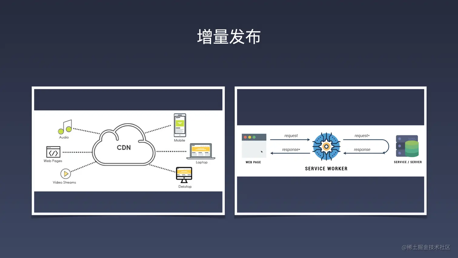 下面是我们的一些在增量发布上面的一些实践。首先对整个 Renderer 层的静态资源进行 CDN 托管。对于我们整个应用,不会将 Renderer 层的静态资源打包到最终的桌面端程序内,将资源远程托管,同时我们根据一些特定的业务场景,可以利用 service worker 能力,对整个资源做一个离线缓存,并且对静态资源做版本控制。