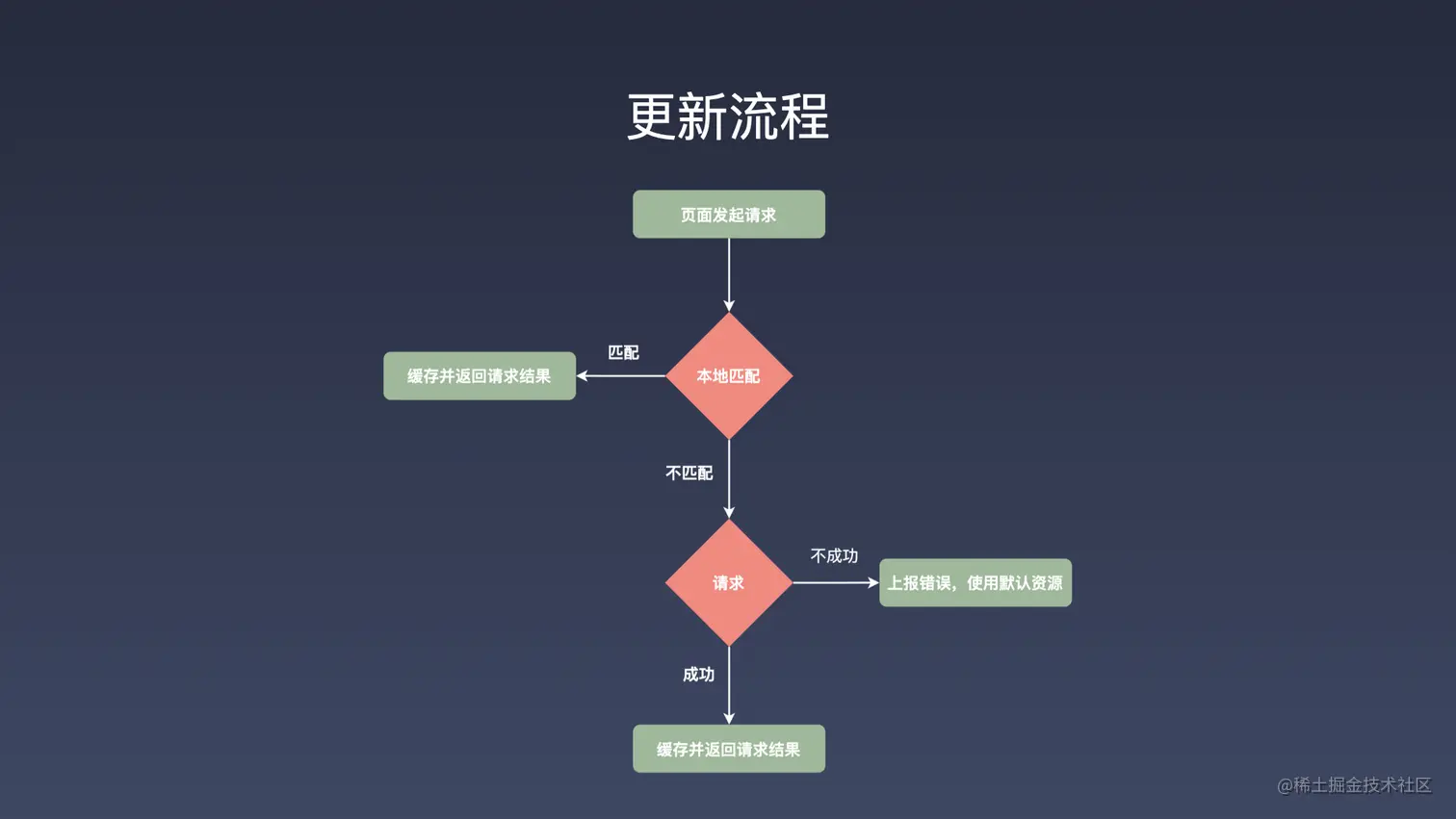 Renderer 层的一个更新流程是这样的,当页面发请求的时候,首先会匹配本地有没有这样的一个资源的缓存,如果我们匹配到资源,就会返回匹配到的结果。如果说本地没有匹配到的话,就重新请求最新资源,同时将请求的资源进行缓存。如果说在整个请求的过程中出现了错误,需要有一个可使用的默认版本的资源,并且将错误进行上报。