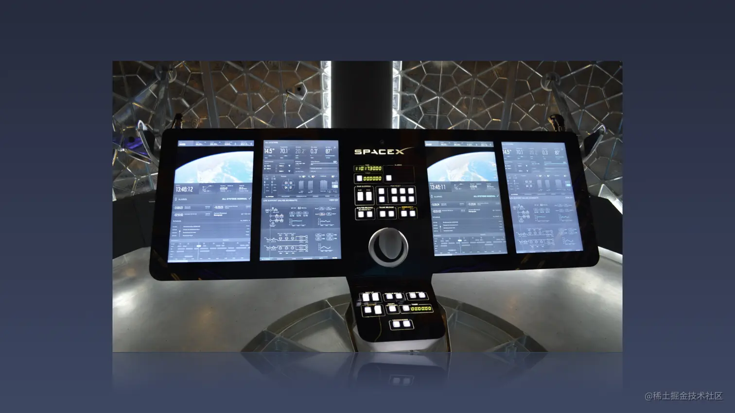 首先我们分享的第一块叫端的延展。不知道大家对这张图熟不熟悉,前段时间的新闻大家应该都听到过,硅谷钢铁侠艾隆马斯克发布了第一款商业化的载人龙飞船,这张图片中就是龙飞船的控制台,知乎上有人对这张图的评价叫 Js 上天了。为什么说叫 Js 上天了呢?因为有传言说它是基于 Electron 开发的,不过这个消息并没有得到证实。但是可以证实的一点是航天飞船的触控界面 UI ,确实是基于 Chromium + JavaScript 这样的架构来实现的。这也从某种程度上说明了这种架构的一个可用性和稳定性的能力。