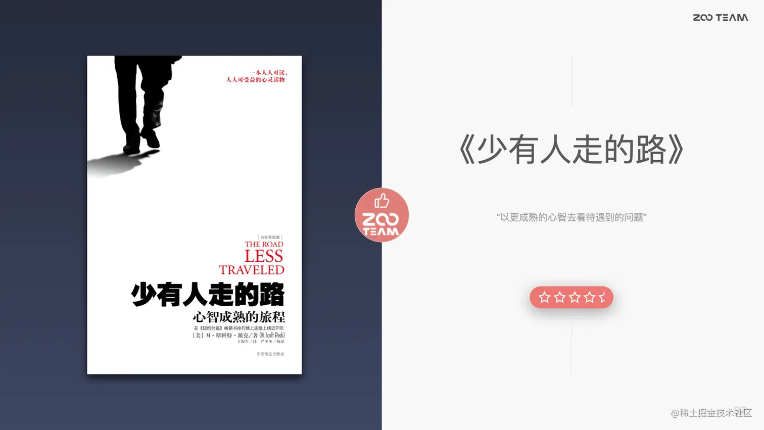 下面是我个人所推荐的一本书《少有人走的路》,从书中可以收获的是如何以更成熟的心智去看待所遇到的问题。在成长过程中,限制我们的,更可能是认知以及思维局限性。以什么认知和心态去看待遇到的问题,就会决定会以什么样的反应和什么样的能力去回应这些问题。这本书会让我们更多的去探索,怎样以更成熟的心智去看待所遇到的问题。