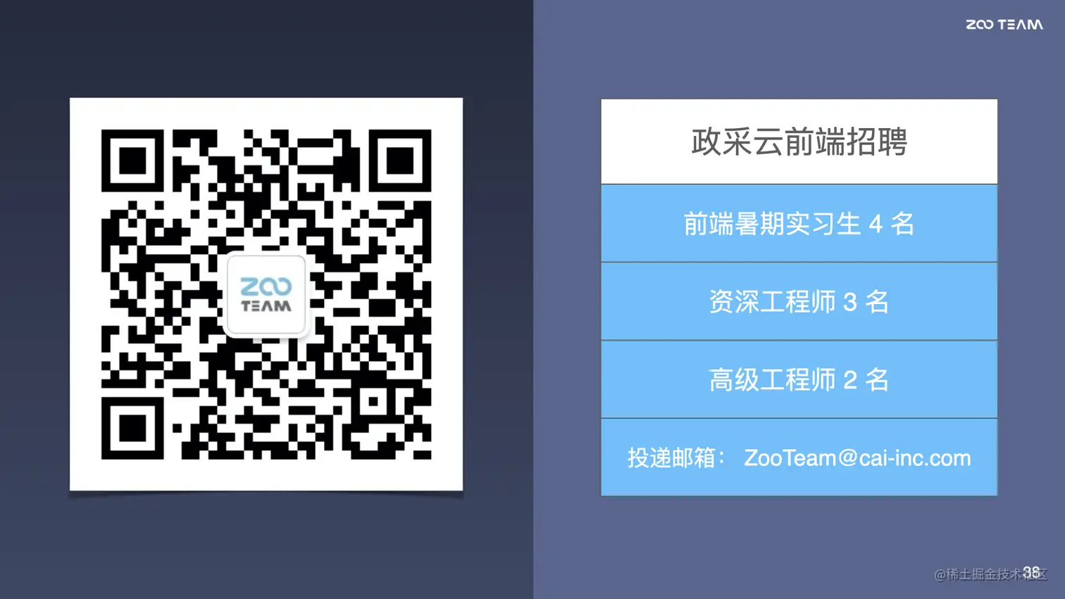 以上就是我今天的所有的分享,这边是我们团队公众号的二维码,大家可以去了解一下我们团队的一些输出,同时我们近期也是在招聘前端实习生、资深、高级前端工程师。如果有兴趣的话,可以向下面的邮箱进行简历的投递,感谢大家~