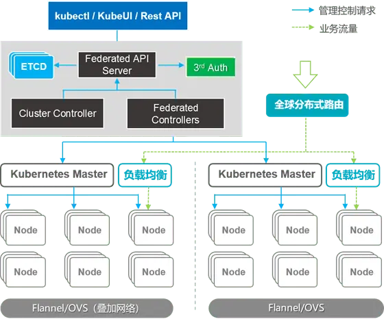 第一代架构中,引入了Federated API Server,用于增加集群相关API,屏蔽集群差异,统一请求入口,同时提供一个Cluster Controller用于管理多个集群状态、集群级别对象创建,并且Service Controller用来实现跨集群服务发现。整体架构如下图所示: