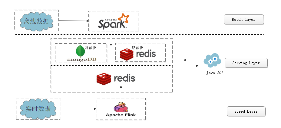 针对这个问题,我们参考了 Storm 的作者 Nathan Marz 提出的 Lambda 三层架构,包括批处理层 (Batch Layer) 、流数据层(Speed Laye)、服务层(Serving Layer)。
