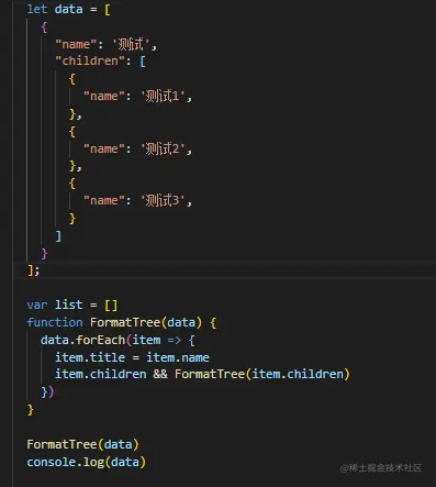 let data = [ { "name": '测试', "children": [ { "name": '测试1', }, { "name": '测试2', }, { "name": '测试3', } ] }];var list = []function FormatTree(data) { data.forEach(item => { item.title = item.name; item.children && FormatTree(item.children) })}FormatTree(data)console.log(data)