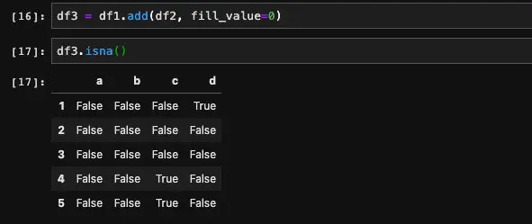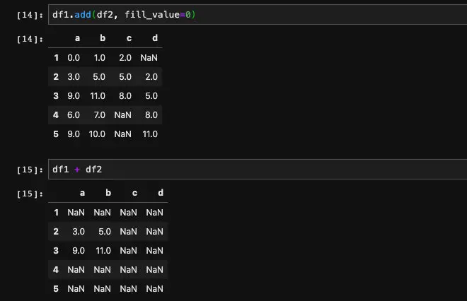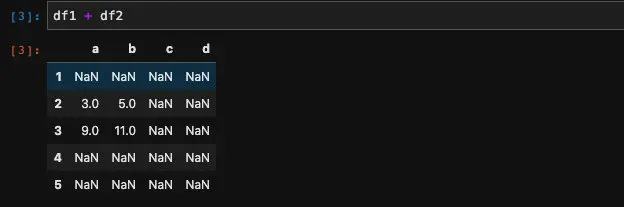 我们对比下结果就能发现了,相加之后的(1, d), (4, c)以及(5, c)的位置都是Nan,因为df1和df2两个DataFrame当中这些位置都是空值,所以没有被填充。