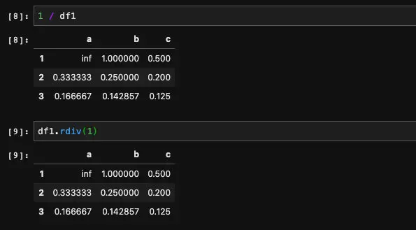 看起来费解,但是说白了一文不值,radd是用来翻转参数的。举个例子,比如说我们希望得到DataFrame当中所有元素的倒数,我们可以写成1 / df。由于1本身并不是一个DataFrame,所以我们不能用1来呼叫DataFrame当中的方法,也就不能传递参数,为了解决这种情况,我们可以把1 / df写成df.rdiv(1),这样我们就可以在其中传递参数了。
