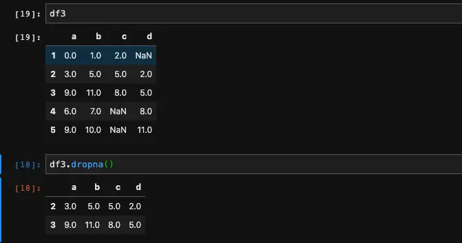 当然只是发现是否是空值肯定是不够的,我们有时候会希望不要空值的出现,这个时候我们可以选择drop掉空值。针对这种情况,我们可以使用DataFrame当中的dropna方法。