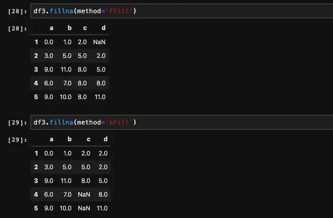 除了可以计算出均值、最大最小值等各种值来进行填充之外,还可以指定使用缺失值的前一行或者是后一行的值来填充。实现这个功能需要用到method这个参数,它有两个接收值,ffill表示用前一行的值来进行填充,bfill表示使用后一行的值填充。