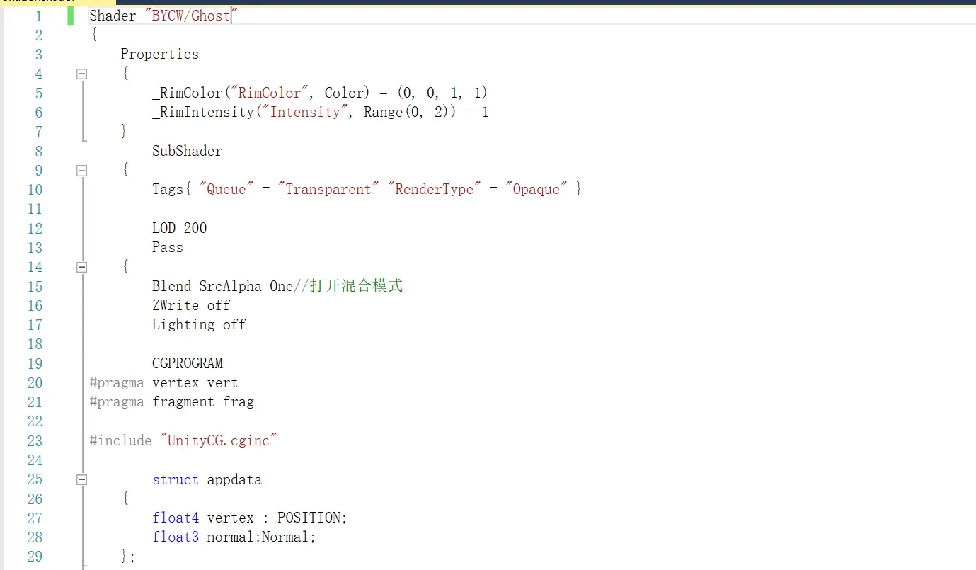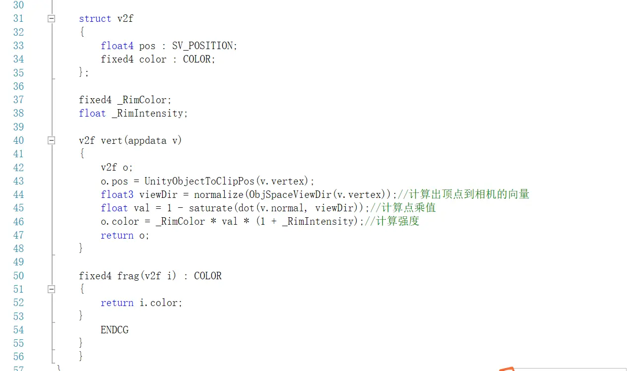 首先我们咋一看是不是有点像在医院拍的X光的片子?那么这个效果我们也可以叫它X光效果。可以看出中间颜色比较深,边缘颜色比较浅,其实这就是利用法线与视线的向量点乘来进行计算的,其余细节接下来再说,然后根据这个点乘值进行着色。最终呈现出来。这边先上Shader代码:推荐一个学习交流群:1072209430
