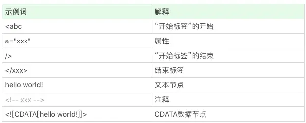 之后我们再读一个字符,比如就是 x,那么就知道这不是注释和 CDATA ,接下来就一直读,直到遇到“>”或者空格,这样就得到了一个完整的词(token)。