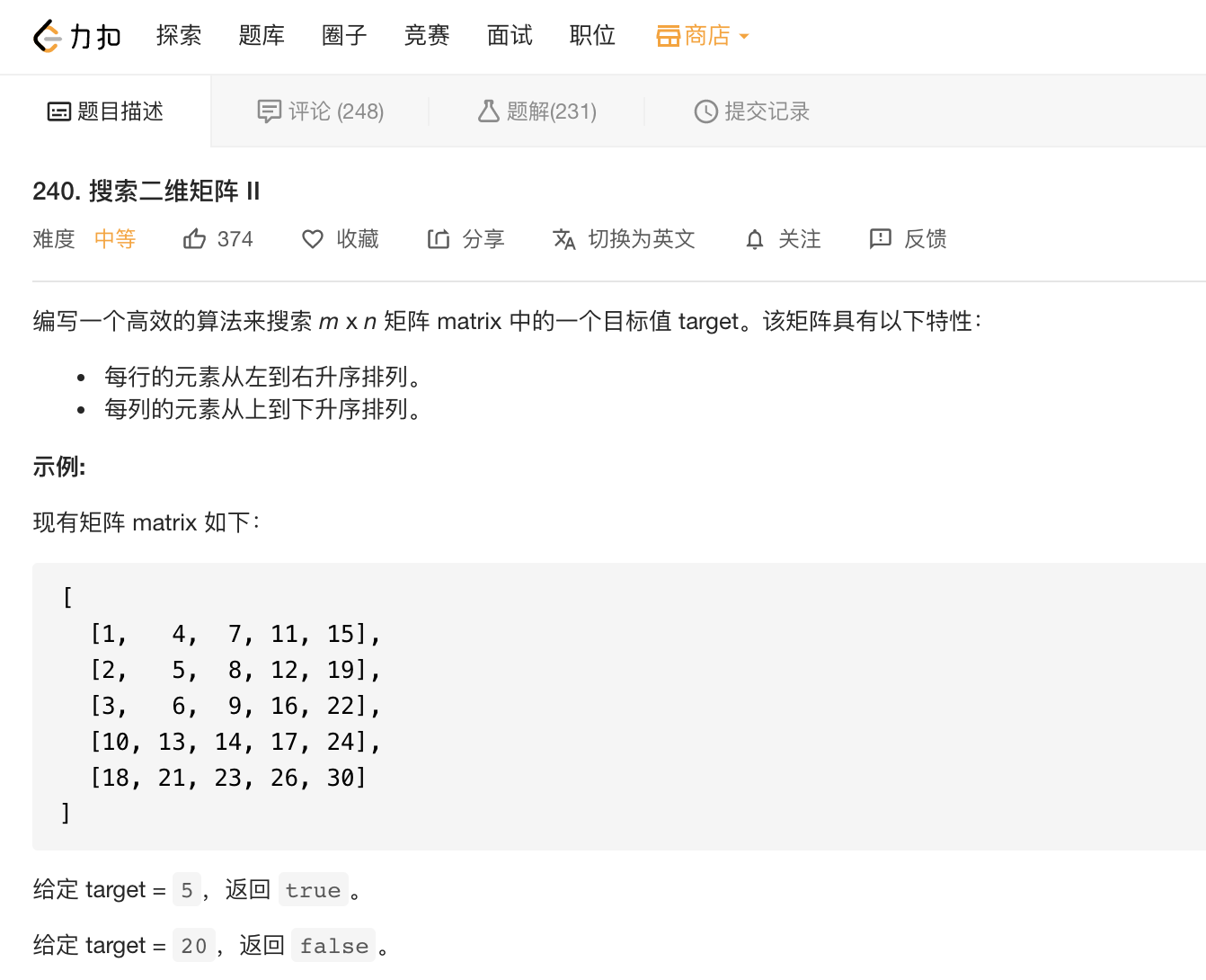 [leetcode]用双指针压缩搜索空间 采九朵莲 2020-07-20 303 阅读1分钟 算法复杂度就像海绵🧽宝宝里的水, 挤一挤总会有的 鲁迅先生没有说过这句话 用双指针可压缩搜索空间, 降低复杂度的维度, 类似于动态规划算法中的压缩状态 这一题我们可以采用双重循环或者用hashTable来用空间换时间, 那么如何才能实现使用O(n)时间复杂度且使用O(1)空间复杂度来解决这个问题呢, 这时可利用双指针,一左一右指针, 指针在相互对撞的同时压缩了双重循环所需的搜索空间 这一题直观上好理解, 但是实际证明比较复杂 本题可以思考从矩阵的右上角开始寻找目标, 如果大于目标值, 则水平方向压缩搜索空间, 反之则垂直方向压缩搜索空间