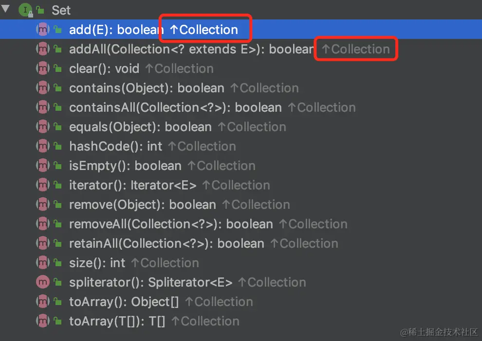 首先是set接口,我们看下接口的方法其实可以发现,它定义的所有接口都来自Collection,并没有定义任何属于它的新接口。其实看Collection就可以了