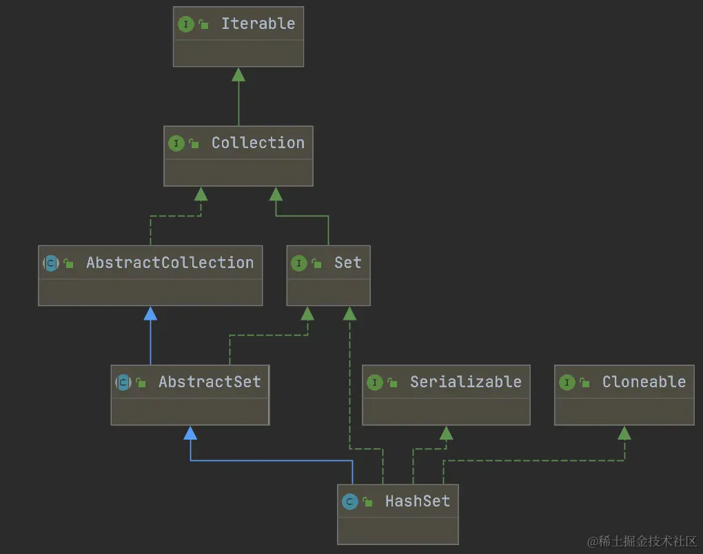 原来HashSet是通过HashMap来实现的,数据结构和HashMap也是一致,它把HashMap的KeySet作为HashSet。