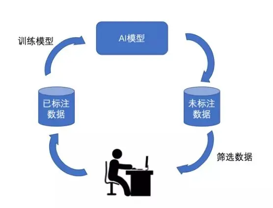 主动学习(ActiveLearning,AL)是一种挑选具有高信息度数据的有效方式,它将数据标注过程呈现为学习算法和用户之间的交互。其中,算法负责挑选对训练 AI 模型价值更高的样本,而用户则标注那些挑选出来的样本。如“Human-in-the-loop”交互式数据标注框架,通过用户已标注的一部分数据来训练 AI 模型,通过此模型来标注剩余数据,从中筛选出 AI 模型标注较为困难的数据进行人工标注,再将这些数据用于模型的优化。几轮过后,用于数据标注的 AI 模型将会具备较高的精度,更好地进行数据标注。