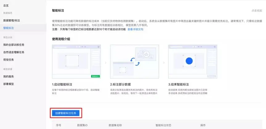 Step1 启动智能标注 在“数据管理/标注”上传完训练数据集后,即可激活“创建智能标注任务”按钮(图2),点击该按钮后,进入数据集选择。需要注意的是,系统将自动对选择的数据集进行校验。校验规则如下: