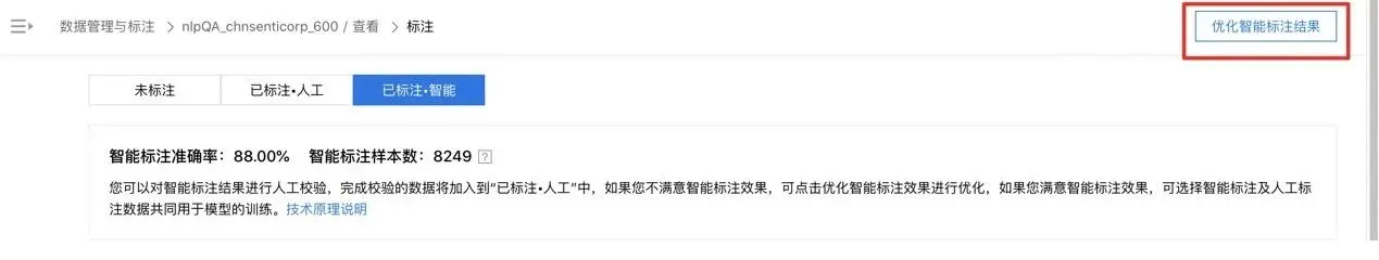 确认所有推荐数据的预标注后,用户可以自主选择是否进行下一轮数据筛选。图像智能标注中,若用户不中止智能标注,则系统会自动进行下一轮;文本智能标注中,由于文本数据集规模一般较大,确认数据预标注的人力成本较高,为了提升用户体验,系统不默认进入下一轮迭代,用户可点击右上角的“优化智能标注结果”进行下一轮筛选(图5)。通过多轮筛选,数据预标注准确性也会不断提升。为了保证数据标注智能,建议用户至少进行一轮的数据筛选或“优化智能标注”。