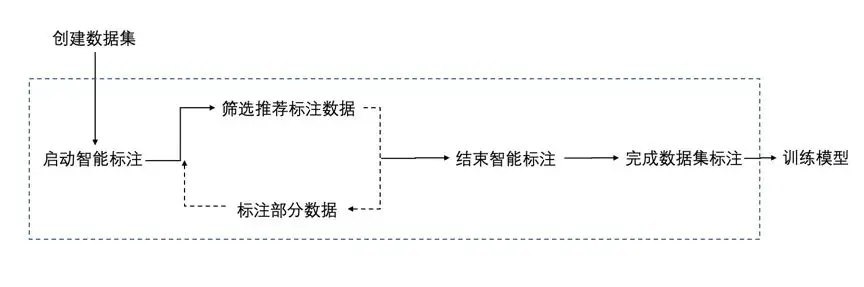 Step3 结束智能标注 当用户觉得当前推荐数据的预标注已足够准确,不再进行下一轮数据标注推荐筛选,或者系统自动判断当前标注的数据已足够时,则进入结束智能标注阶段。在图像智能标注中,系统会弹出提示(图6),选择“一键标注”系统会自动标注剩余未标注数据,选择“立即训练”则停止智能标注,之后可以利用已确认的标注数据去训练模型;在文本智能标注中,不选择“优化标注结果”则认为停止智能标注,系统自动标注所有未标注数据,并归为“已标注·智能”数据集,该类数据与“已标注·人工”均可用于模型训练。