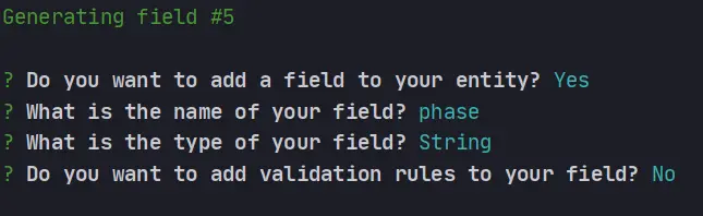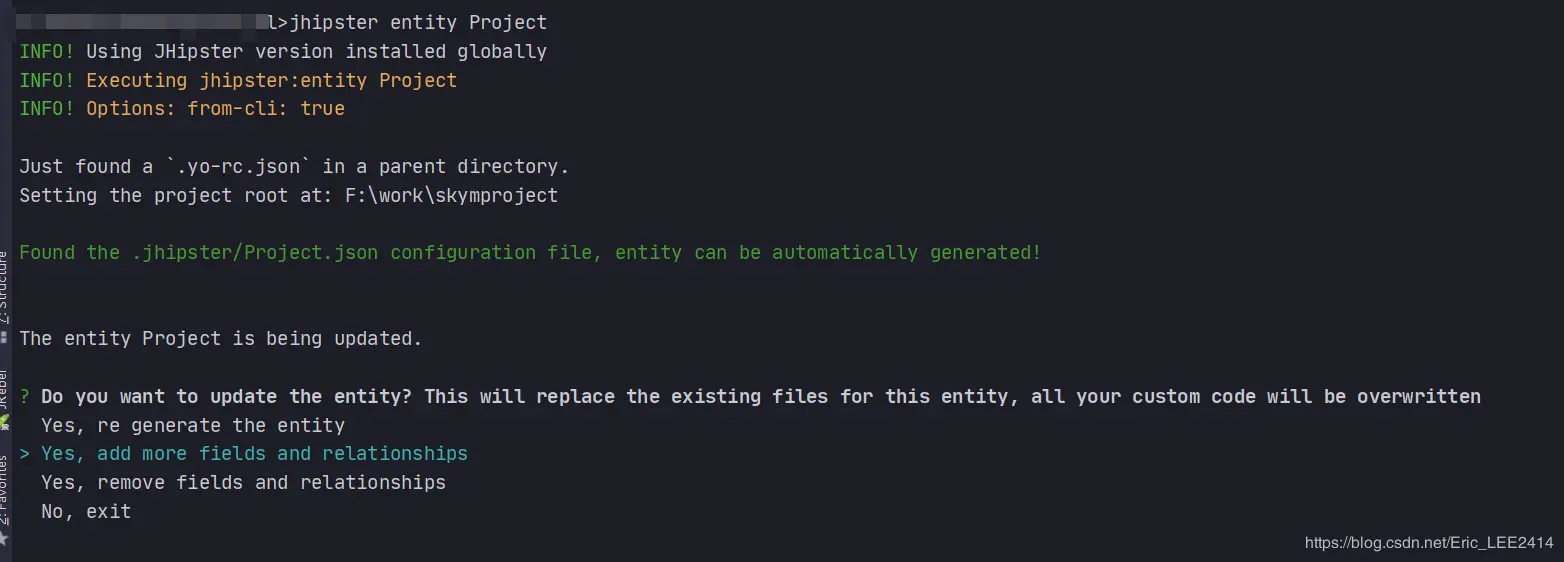 jHipster对已有的实体类进行编辑 fly_piggy 2020-07-20 839 阅读1分钟 解决问题:当我们需要用jHipster增加或者删除一个字段(或者关系)时,我们不需要修改jdl文件可以直接使用以下命令。 jhipster entity Project Project就是要修改的实体类 我们现在需要给Project实体类增加一个phase字段 选择 选择No,不需要添加关系 > 接下来 选择a,就相当于all修改接下去所有的文件,我们可以利用git来回滚我们不需要修改的文件 新增字段已经完成了,我们接下来需要利用liquiBase来生成changLog的数据库修改文件 保持镇定,继续前进