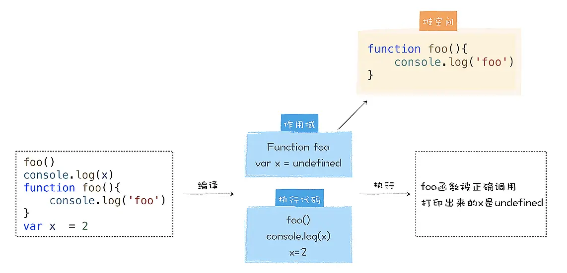 V8在编译阶段,对函数声明和变量声明会做变量提升到作用域中。变量提升到作用域时,会设置默认值undefined;函数声明提升到作用域时,V8会在内存中创建该函数对象,并提升整个函数对象。