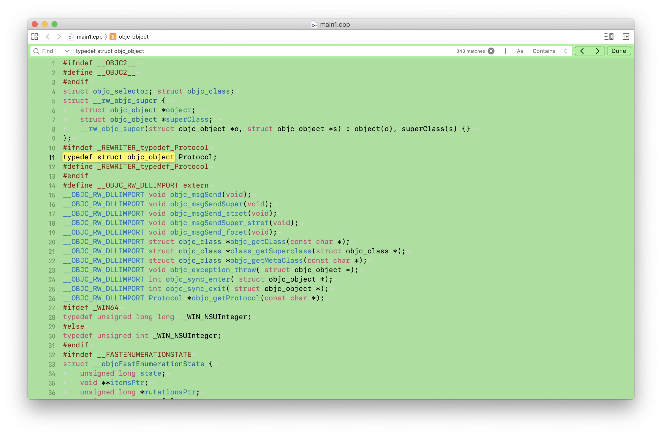 我们再次进行全局 搜索 typedef struct objc_object得到843个结果,可见这个结构体一定定义了很多很多的东西。
