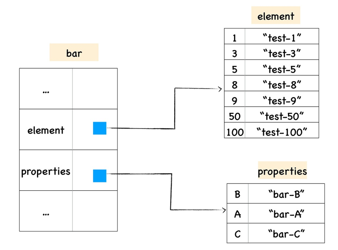 在elements对象中,会按照顺序存放排序属性,properties属性则指向了properties对 象,在properties对象中,会按照创建时的顺序保存了常规属性。