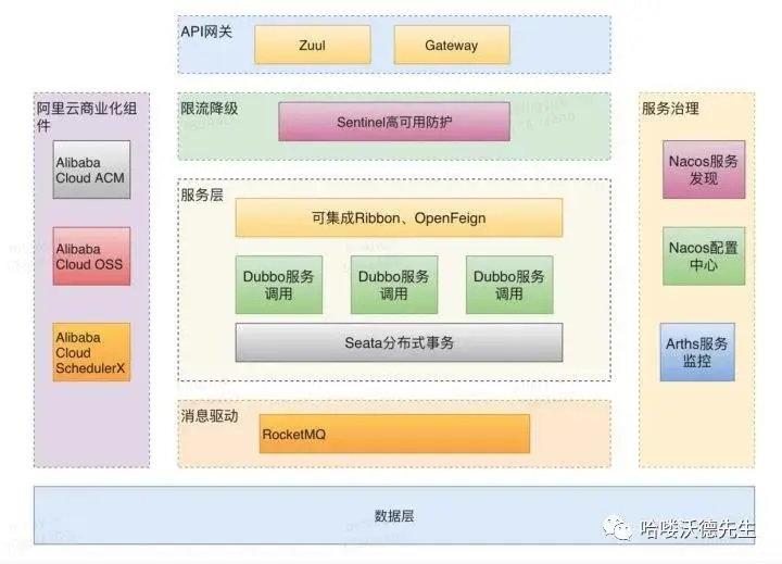 这幅图是 Spring Cloud Alibaba 系列组件,其中包含了阿里开源组件,阿里云商业化组件,以及集成 Spring Cloud 组件。