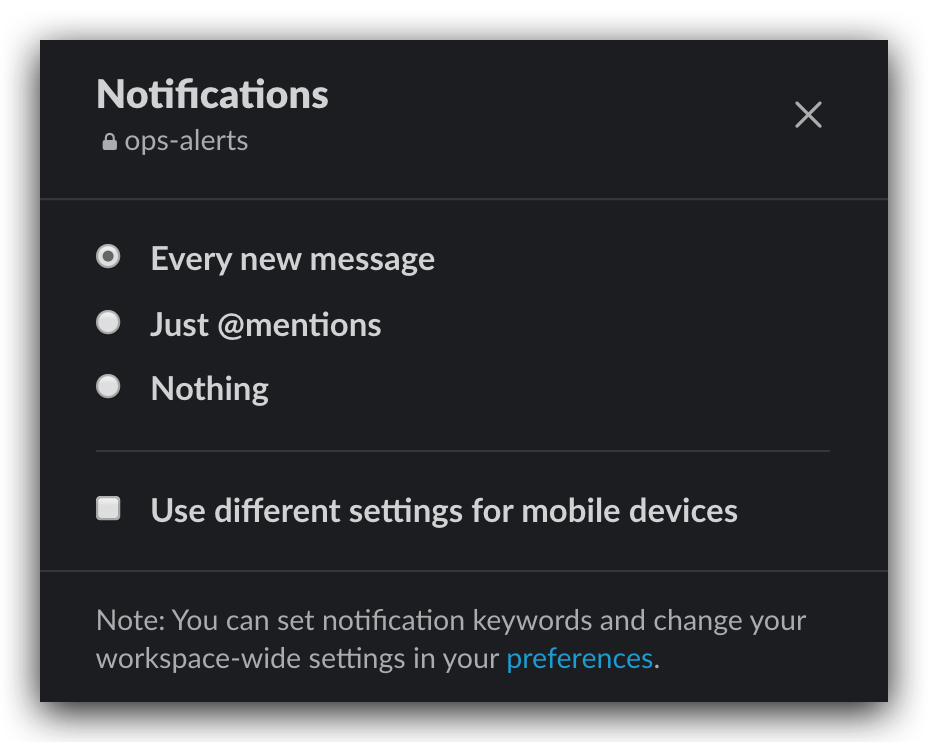 DevOps 团队成员将该频道的 Notification Preferences 改为 Every new messages,或是在全局 Preferences -> Notifications -> My keywords 中配置好例如 failed、warning 之类的关键字,即可确保通知消息能够及时送达 iPhone、iMac 等终端。