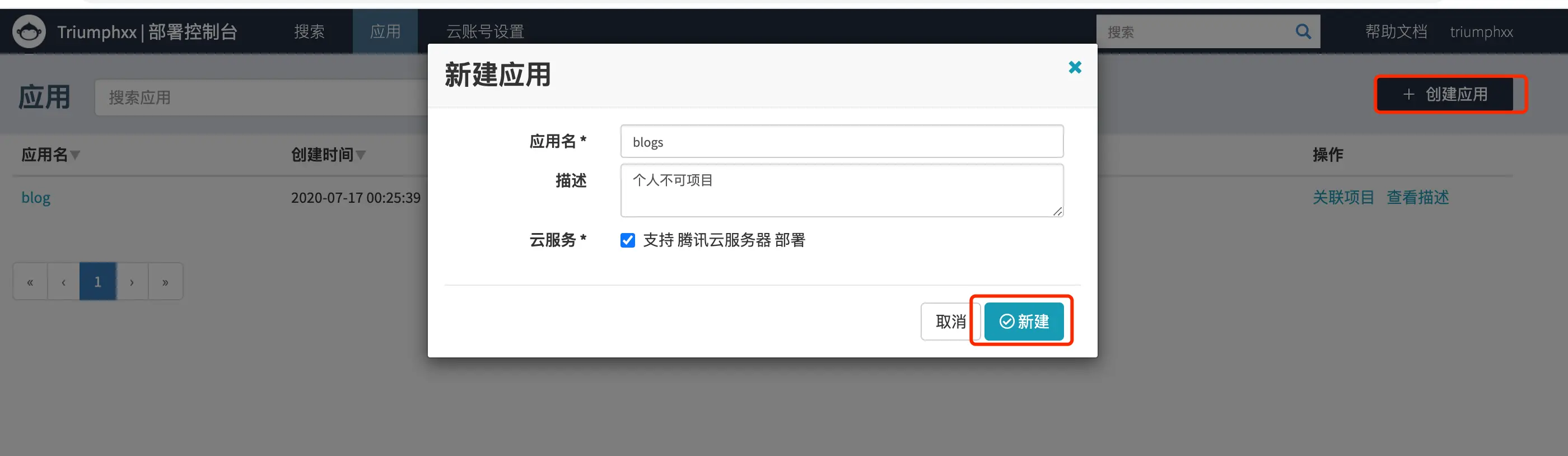 点击创建应用,填写信息
