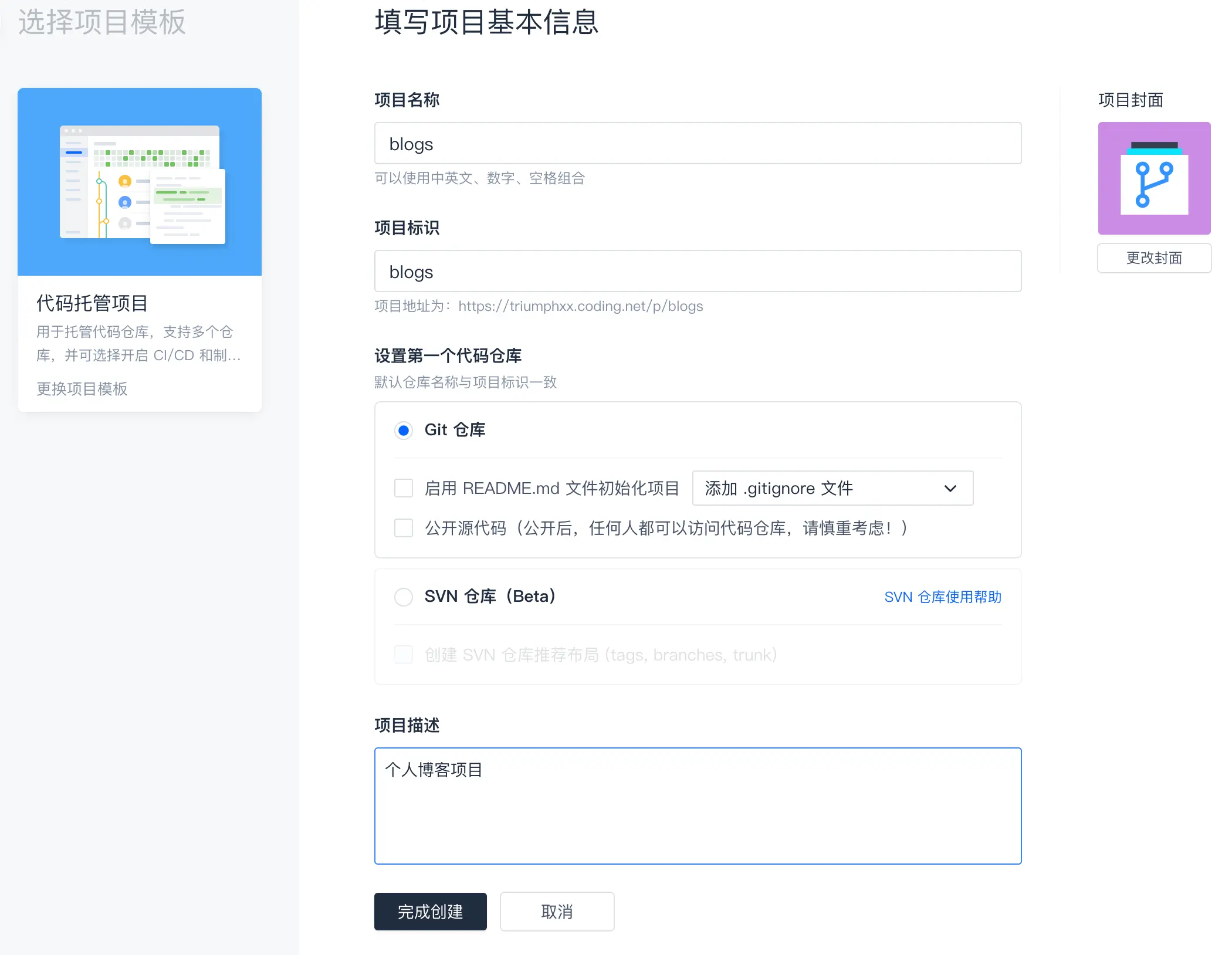 项目-->创建项目-->代码托管项目如,创建的你的博客项目为blogs
