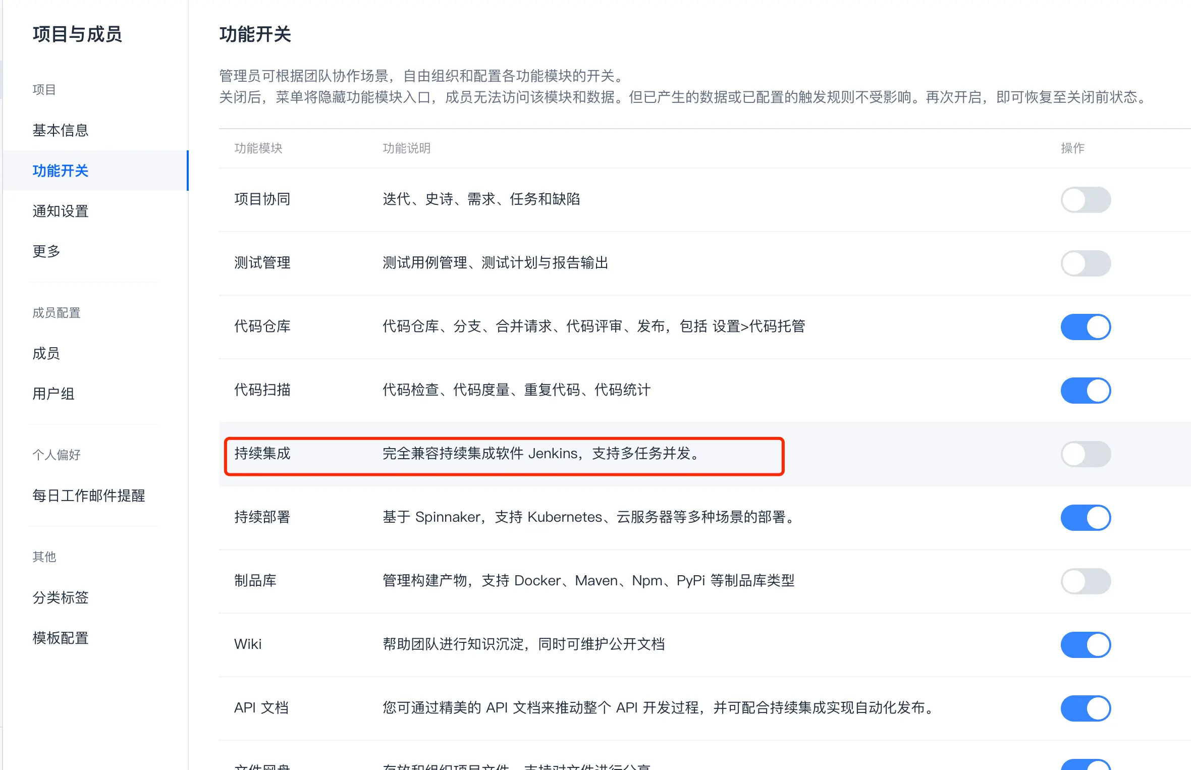 conding进入到代码仓库,就能够看到编译后文件。 这时,需要给你项目配置持续部署功能模块。点击右下角项目设置,功能开关 按钮,将持续部署打开。配置持续发布
