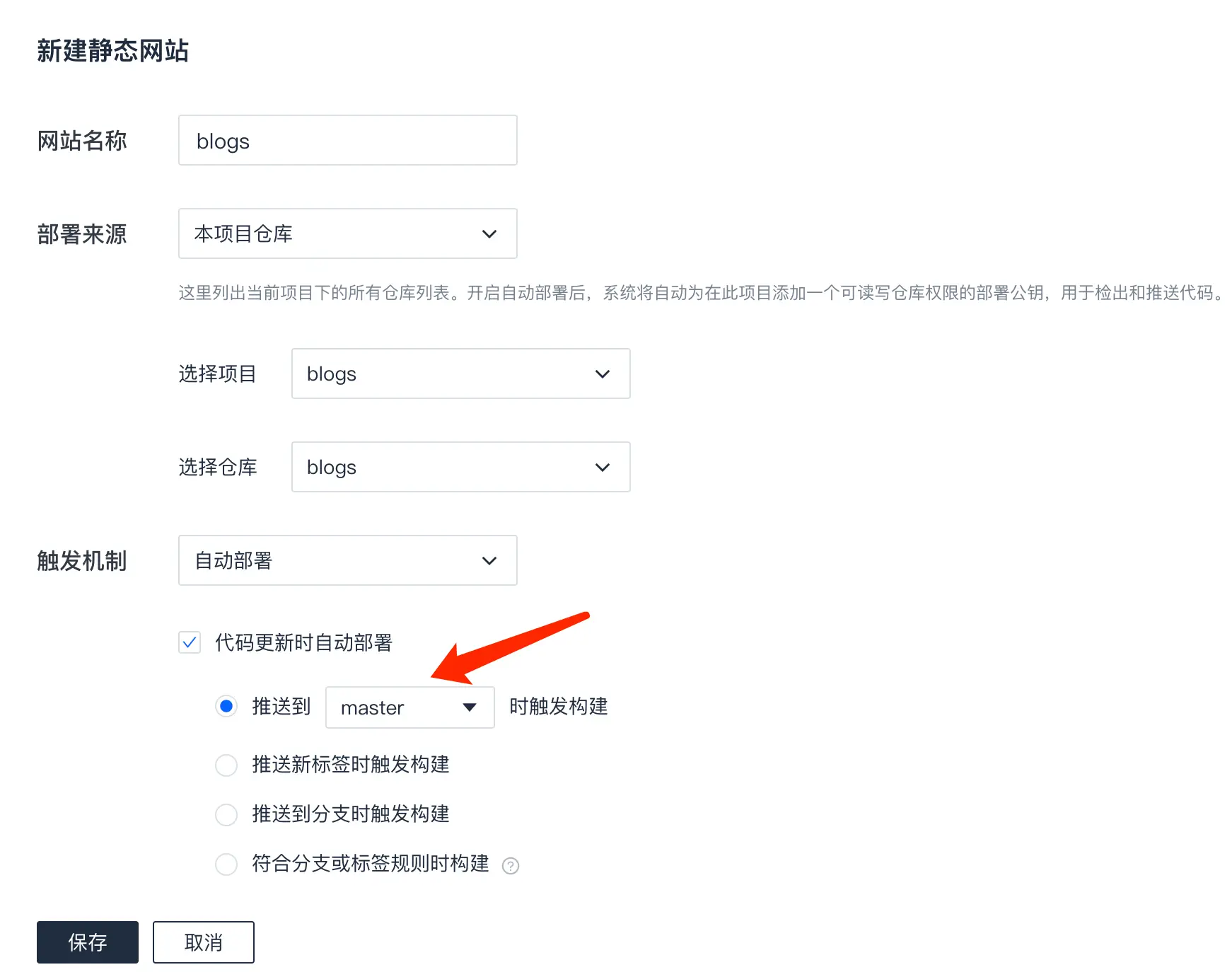 master分支触发构建。点击保存。立即部署