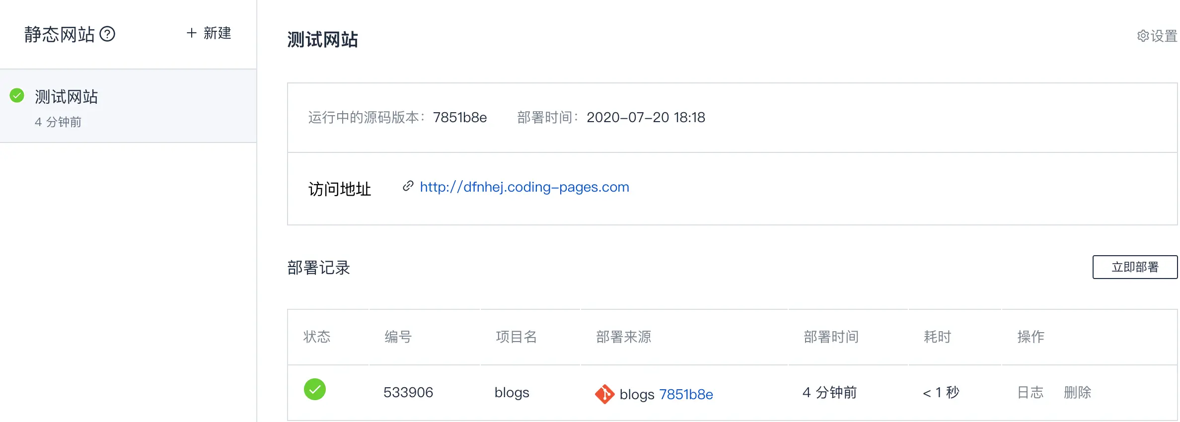 配置完成持续发布后,系统将给你分配一个临时域名,点击立即部署。小伙伴们,如果有自己的域名 到你的域名中心配置即可。