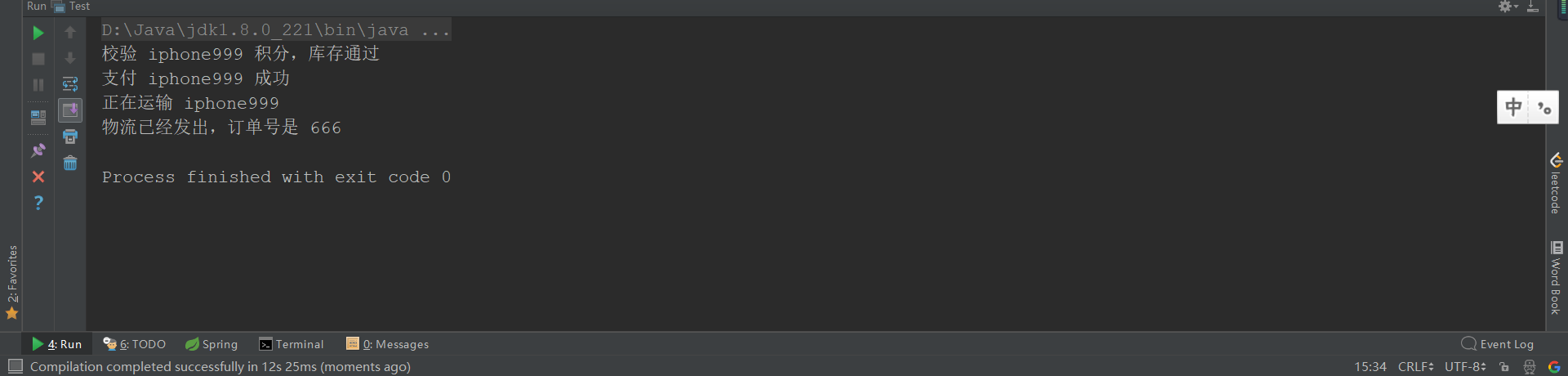 接下来,支付积分的 Service 是不是也是信手拈来,我们直接传入 Gift ,然后直接输出支付成功,return true