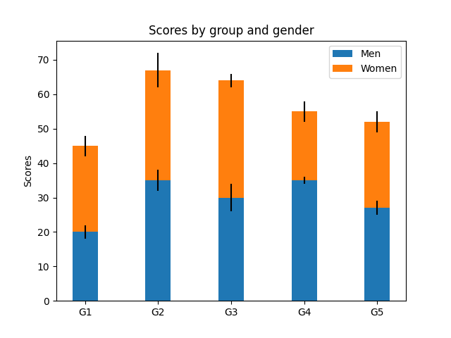 ax.bar(labels, women_means, width, yerr=women_std, bottom=men_means, label='Women')