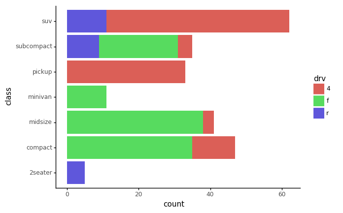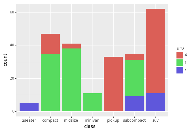 + geom_bar(aes(x='class', fill='drv'))