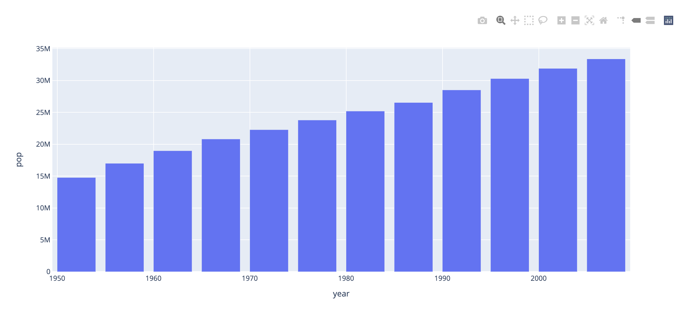 fig = px.bar(data_canada, x='year', y='pop',