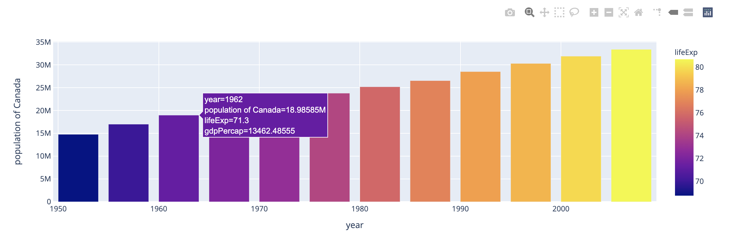 data_canada = px.data.gapminder().query("country == 'Canada'")