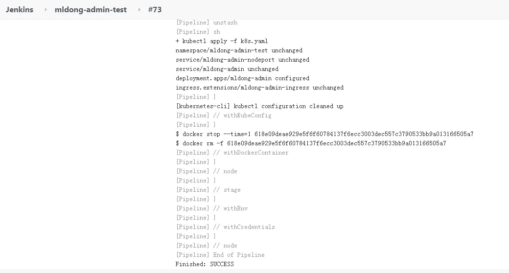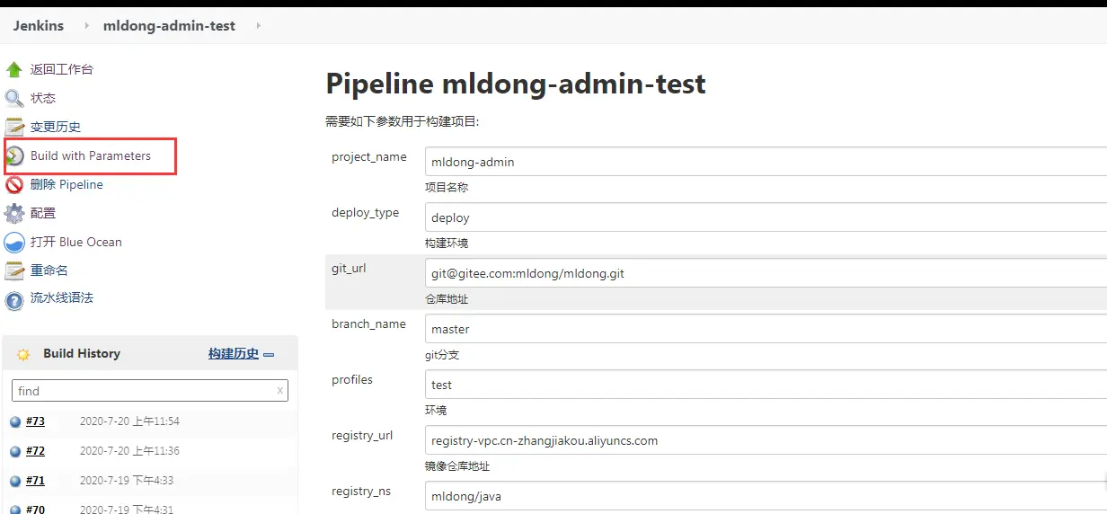 pipeline { agent any // 环境变量 environment { // docker私有仓库凭证 dockerhub_credentials = credentials('ali-dockerhub') // 镜像版本 image_tag = sh(returnStdout: true,script: 'echo `date +"%Y%m%d%H%M"_``git describe --tags --always`').trim() } // 入参定义 parameters { string(name: 'project_name', defaultValue: 'mldong-admin', description: '项目名称') string(name: 'deploy_type', defaultValue: 'deploy', description: '发布类型') string(name: 'git_url', defaultValue: 'git@gitee.com:mldong/mldong.git', description: '仓库地址') string(name: 'branch_name', defaultValue: 'master', description: 'git分支') string(name: 'profiles', defaultValue: 'test', description: '环境') string(name: 'registry_url', defaultValue: 'registry-vpc.cn-zhangjiakou.aliyuncs.com', description: '镜像仓库地址') string(name: 'registry_ns', defaultValue: 'mldong/java', description: '镜像命名空间') string(name: 'hostname', defaultValue: 'c.mldong.com', description: '绑定的域名') string(name: 'k8sCredentialsId', defaultValue: 'ali-k8s-config', description: 'k8s集群配置id') string(name: 'k8sServerUrl', defaultValue: 'https://172.26.22.121:6443', description: 'k8s集群服务地址') } stages{ stage('检出代码') { steps{ // 检出代码 checkout([$class: 'GitSCM', branches: [[name: "*/${params.branch_name}"]], doGenerateSubmoduleConfigurations: false, extensions: [], submoduleCfg: [], userRemoteConfigs: [[ credentialsId: 'mldong-gitbash', url: "${params.git_url}"]]]) } } stage("编译打包"){ agent { docker { image 'maven:3-alpine' args "-v /root/.m2:/root/.m2 -v /root/${params.project_name}-config:/root/${params.project_name}-config" } } steps{ // 编译打包 sh "mvn -B -DskipTests clean package" // 删除当前目录下的config sh "rm -rf config" // 复制配置文件到当前工作空间 sh "cp -rf /root/${params.project_name}-config config" sh "pwd" } } stage('构建镜像及推送到docker仓库') { steps { sh "pwd" // 将前一步的配置文件复制到当前目录下 sh "cp -rf ${env.WORKSPACE}@2/config config" // 将前一步生成的jar包复制到当前工作空间下 sh "cp -rf ${env.WORKSPACE}@2/${params.project_name}/target/${params.project_name}.jar app.jar" // 登录镜像仓库 sh "docker login -u ${dockerhub_credentials_USR} -p ${dockerhub_credentials_PSW} ${params.registry_url}" // 构建镜像 sh "docker build -t ${params.registry_url}/${params.registry_ns}/${params.project_name}:${image_tag} ." // 推送镜像到私服 sh "docker push ${params.registry_url}/${params.registry_ns}/${params.project_name}:${image_tag}" // 删除当前目录下的config sh "rm -rf config" // 删除当前目录下的app.jar sh "rm -rf app.jar" } } stage('生成k8s发布模板') { steps { // 生成k8s发布模板 sh "sed -e 's#{{APP_NAME}}#${params.project_name}#g;s#{{NAMESPACE}}#${params.project_name}-${params.profiles}#g;s#{{PROFILES}}#${params.profiles}#g;s#{{IMAGE_URL}}#${params.registry_url}/${params.registry_ns}/${params.project_name}#g;s#{{IMAGE_TAG}}#${image_tag}#g;s#{{HOST}}#${params.hostname}#g' k8s.tpl > k8s.yaml" // 暂存文件 stash name: "k8s.yaml", includes: "k8s.yaml" // 查看文件 sh "cat k8s.yaml" } } stage("kubectl apply") { agent { docker { image 'lwolf/helm-kubectl-docker' } } steps { withKubeConfig([credentialsId: "${params.k8sCredentialsId}",serverUrl: "${params.k8sServerUrl}"]) { // 取出文件 unstash("k8s.yaml") // 发布到k8s集群 sh 'kubectl apply -f k8s.yaml' } } } } }使用说明