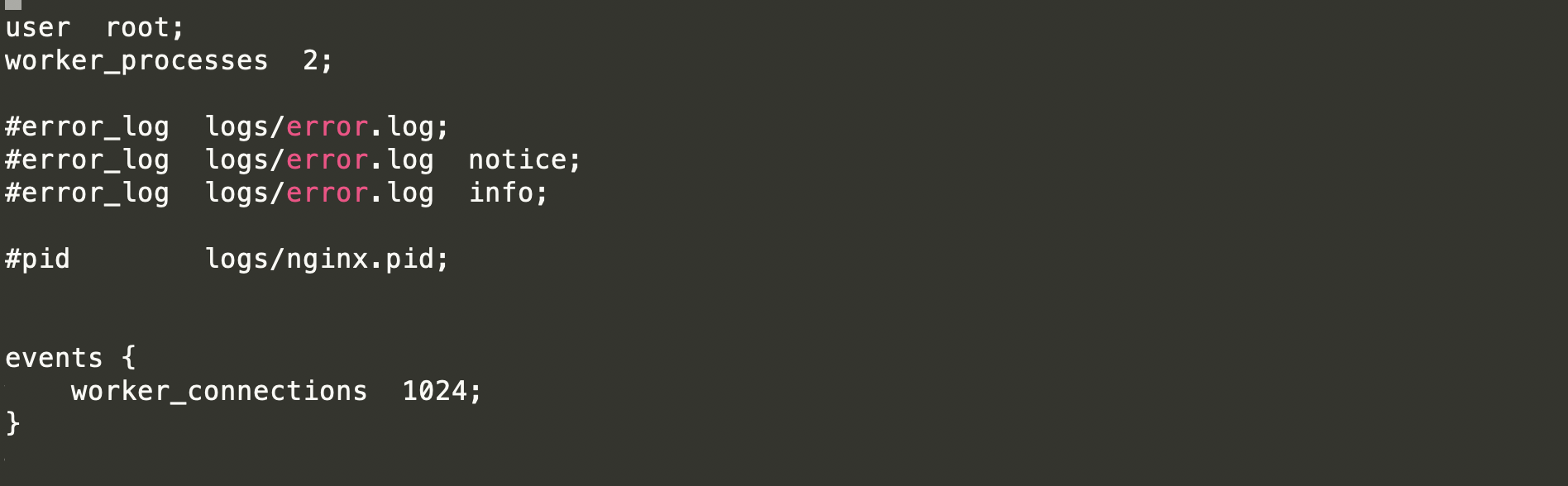 在配置文件开始到events 块之前的内容,该块可以配置启动nginx所使用的用户、错误日志文件存放地址和work进程数量等