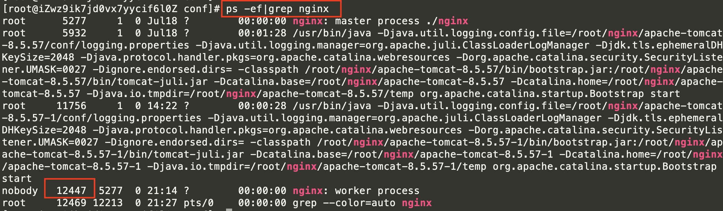 所以在reload命令执行后work进程的id是会发生变化的,查看nginx进程PID如下所示