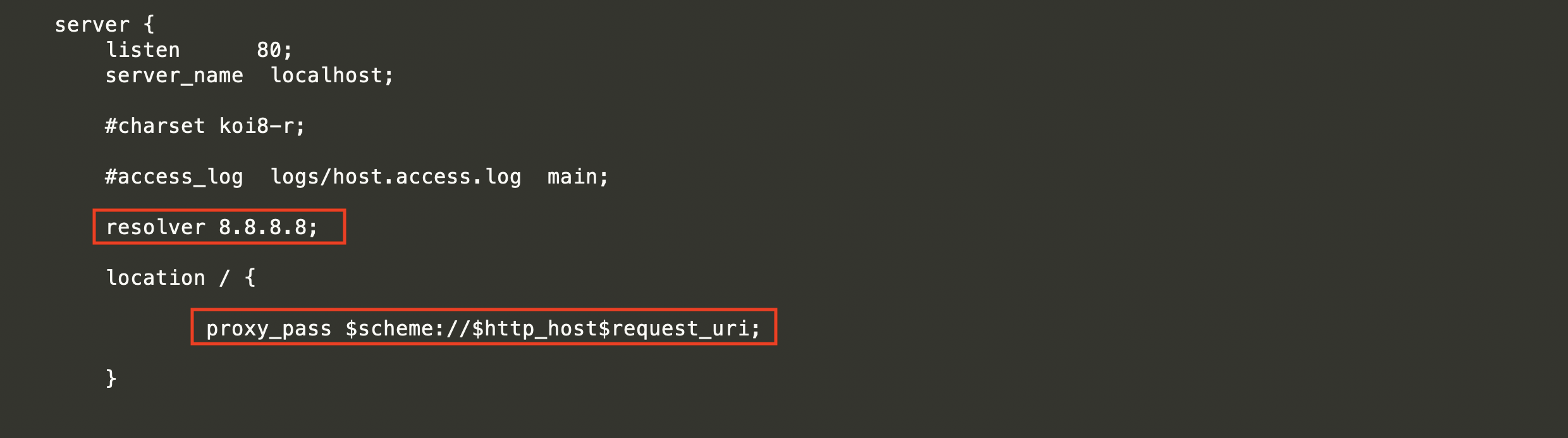resolver配置为google的dns服务器,location中的proxy_pass中都是nginx的变量,代表了请求中的ip等参数。