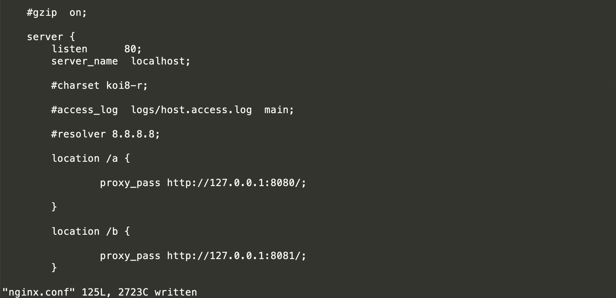 因为要代理两台tomcat,通过配置两个location来指向不同的toncat,通过url中的/a和/b来匹配到对应的tomcat。
