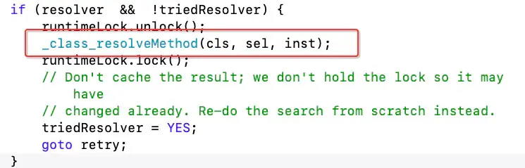 bool resolved = msg(cls, SEL_resolveInstanceMethod, sel);