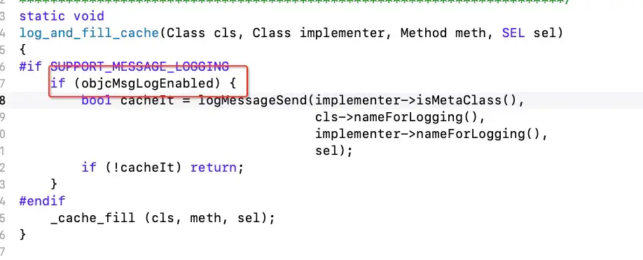 通过查看lookUpImpOrForward源码,如上图,当查找到IMP时,会调用log_and_fill_cache方法,进行缓存填充和日志存储。