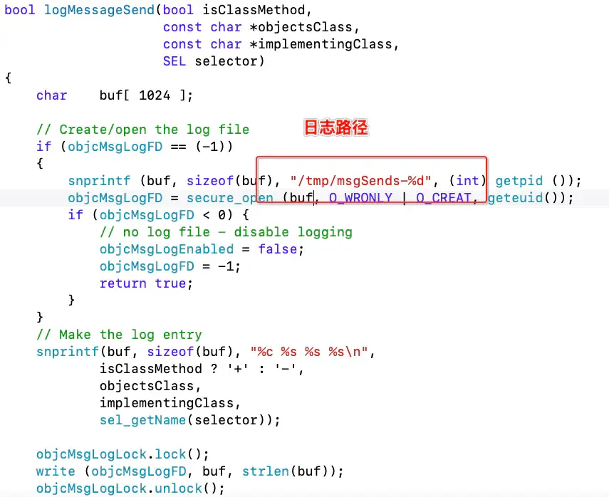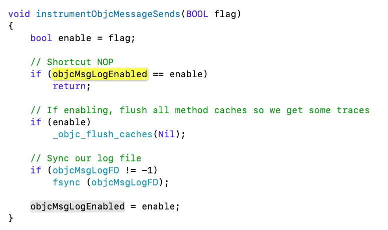 log_and_fill_cache如上图,通过控制objcMsgLogEnabled来控制日志存储,日志会记录在/tmp/msgSends目录下,而objcMsgLogEnabled的赋值是在instrumentObjcMessageSends之中,可以暴露这个方法,来达到外部打日志的操作。