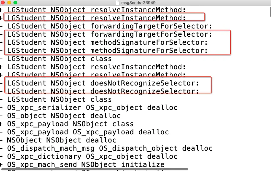 发现调用resolveInstanceMethod:, forwardingTargetForSelector,methodSignatureForSelector,doesNotRecognizeSelector一系列方法,进行消息转发。