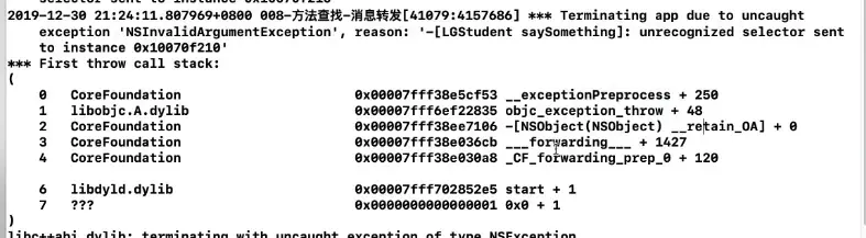 由此可见,系统最后是在doesNotRecognizeSelector方法中抛出异常的,所以重写forwardInvocation方法后,不管里面有么有实现,或者执行父类的方法,程序都是不会崩溃的。
