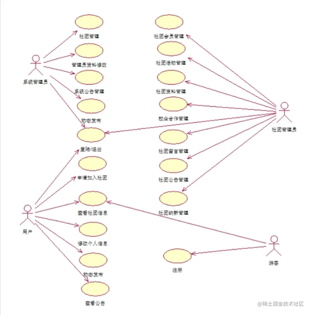 社团管理员:{ 社团会员管理 社团活动管理 社团资料管理 社团留言管理 社团公告管理 社团纳新管理 校企合作管理(未实现) }